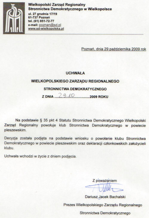 Na podstawie & 35 pkt. 4 Statutu Stronnictwa Demokratycznego, Wielkopolski Zarząd Regionalny wznowił działalność Klubu Stronnictwa Demokratycznego w powiecie pleszewskim z dniem 29.10.2009 r. Decyzja została podjęta na podstawie wniosku o wznowienie działalności Klubu Stronnictwa Demokratycznego w powiecie pleszewskim oraz deklaracji członkowskich założycieli klubu. Na pierwszym zebraniu członków Klubu SD w wyborach jawnych, na stanowiska wybrano następujące osoby: